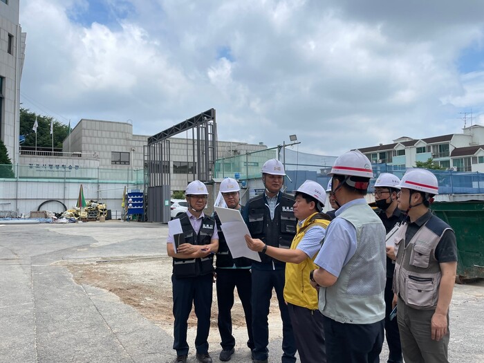 이근수 경기 김포시 도시주택국장은 지난 22일 여름철 폭염 및 집중호우 대비 공공건축 공사장에 대한 현장 안전 점검을 실시했다. 이번 점검은 이달 14~22일 공공건축 공사장 중 현재 시공 중인 김포 제조융합혁신센터를 포함한 6곳을 대상으로 진행했다. 사진은 이 국장(왼쪽 네 번째)이 공공건축 공사현장 안전 점검을 하고 있는 모습. (사진=김포시청 제공)