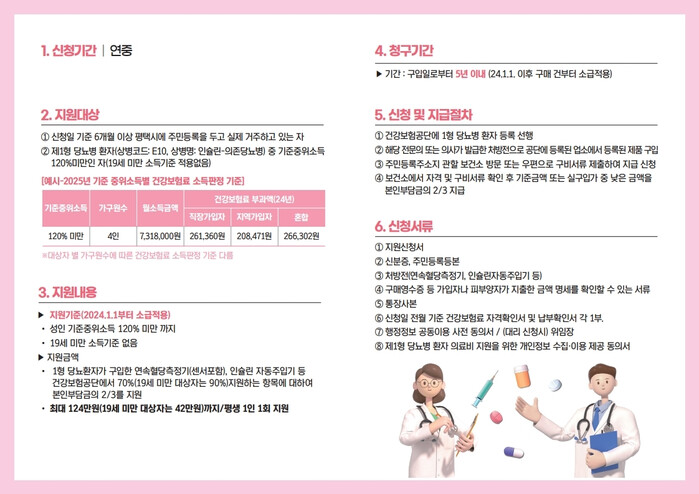 지원항목은 연속혈당측정기(센서 포함)와 인슐린 자동 주입기 2종이며 건강보험공단에서 지원하는 항목에 대해 성인 최대 124만 원(19세 미만 42만 원)까지 본인부담금의 2/3를 지원한다.