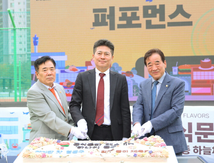 | ‘2025 중구 음식문화 페스티벌’ 참석자들이 기념 케익을 자르며 포즈를 취하고 있다. (사진=중구의회) |