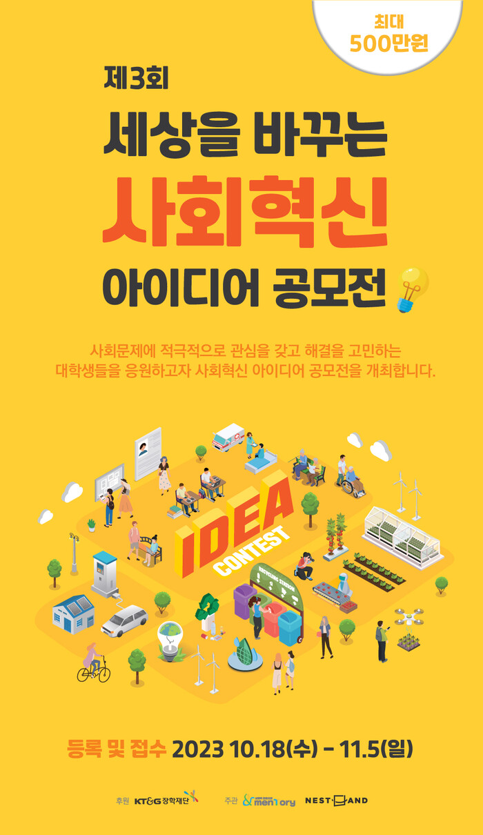 안홍필 KT&G장학재단 사무국장은 “사회문제 해결에 대한 대학생들의 많은 관심과 창의적 아이디어를 기대하고 있다”며 “앞으로도 재단은 혁신 인재 발굴과 육성 등 다양한 지원을 통해 청년 인재들이 사회문제 해결에 기여할 수 있도록 노력할 것”이라고 말했다.