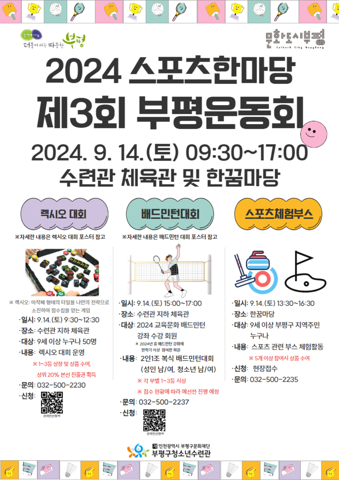 [인천=문찬식 기자] 인천 부평구 청소년수련관이 오는 14일 수련관 한꿈마당ㆍ체육관에서 구민이 함께 즐기는 스포츠한마당 ‘제3회 부평운동회’를 개최한다.
