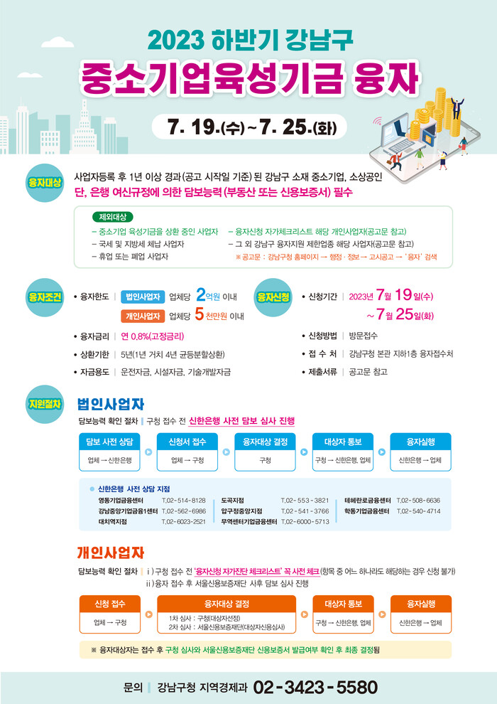 지원대상은 사업자등록 후 1년 이상이 된 강남구 소재 사업장이고, 운영·시설·기술개발에 사용하는 자금으로 융자 한도는 법인사업자 2억원, 개인사업자 5000만원이다. 연 0.8% 고정금리이며, 1년 거치 4년 균등분할상환 조건이다.