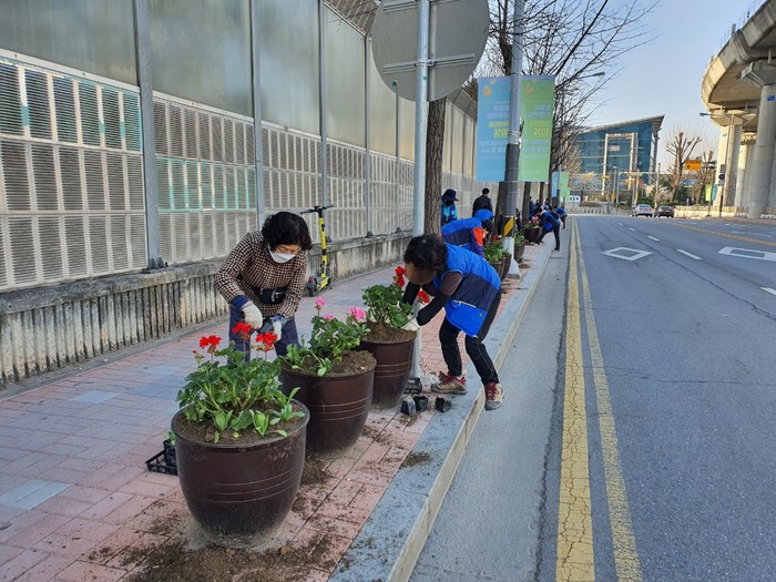 경기 의정부시 장암동은 지난 8일 새봄을 맞이해 마을 대청소와 꽃길가꾸기 행사를 진행했다. 참여자들은 겨우내 묵은 잡초를 제거하고, 도로변 화단 및 화분에 금잔화·사피니 등 봄꽃 2200본을 식재했으며 지역내 주요 도로와 학교 인근 등을 중심으로 환경정화를 실시했다. 사진은 이날 참여자들이 화단에 봄꽃을 식재하고 있는 모습. (사진제공=의정부시청)