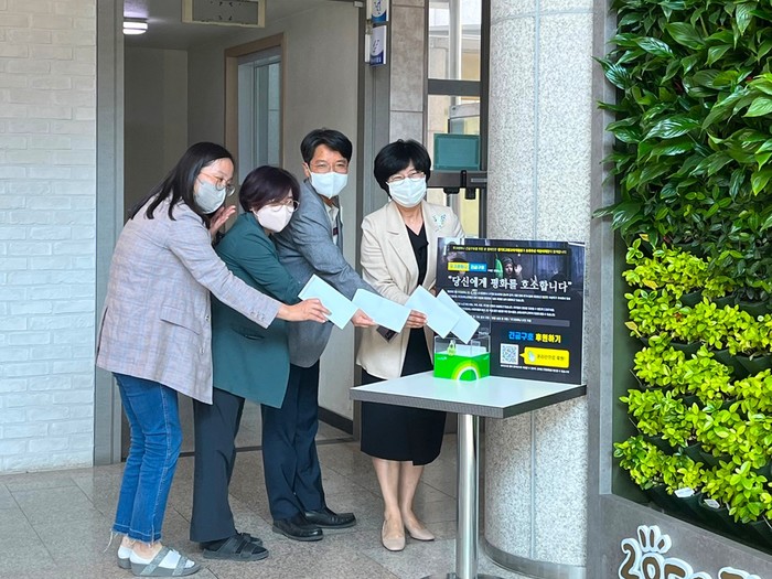 | ▲ 사진제공=원마운트/고양교육지원청 직원들이 우크라이나 어린이 돕기 캠페인에 동참하며 성금을 기부하고 있다. |