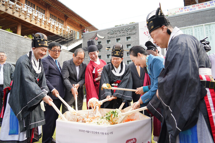 | ▲ 이필형 동대문구청장(왼쪽 다섯 번째)과 행사에 참석한 내빈들이 ‘한방산채비빔밥 나눔 행사’에서 비빔 퍼포먼스를 하고 있다. (사진=동대문구청 제공) |