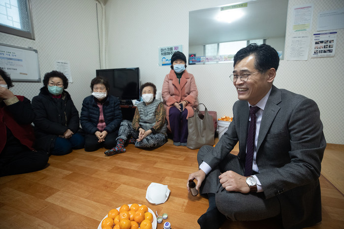 | ▲ 지역 경로당을 방문한 이기재 구청장(오른쪽)이 노인들과 대화를 나누고 있다. (사진제공=양천구청) |