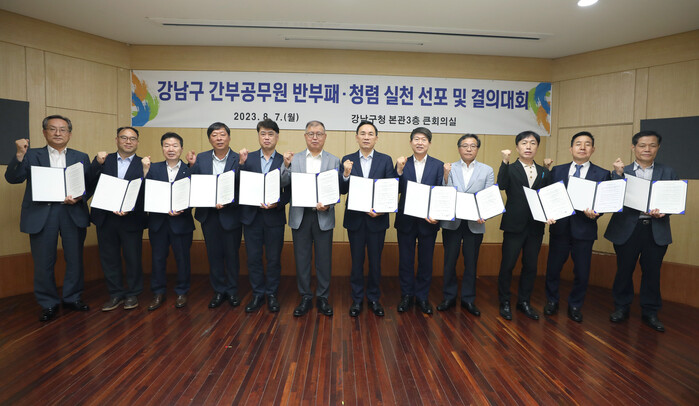 조성명 구청장은 “간부 공무원이 솔선수범으로 나서 청렴 의지를 선포함으로써 공직사회 전체에 청렴 문화가 퍼져나가길 바란다”며 “전 직원이 ‘나로부터 청렴이 시작된다’는 마음가짐으로 임해 구민에게 신뢰받는 강남을 만들겠다”고 밝혔다.