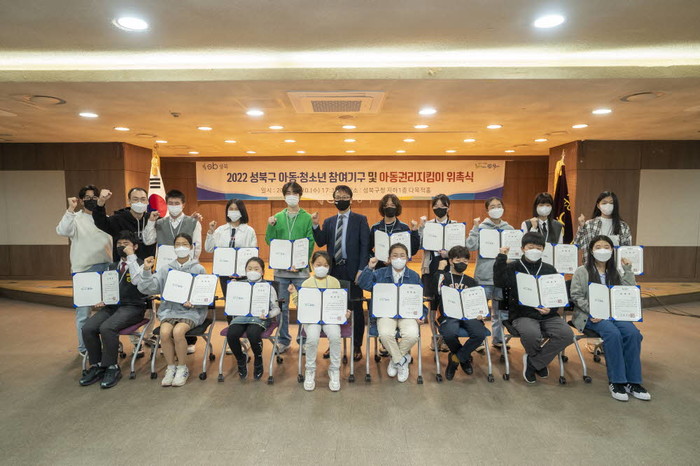 서울 성북구가 최근 2022년 성북구 아동·청소년 참여기구 및 아동권리지킴이 위촉식을 열어 아동의회의원 5명, 어린이의회의원 23명, 청소년의회의원 17명, 참여위원 및 아동권리지킴이 23명 총 68명을 위촉했다. 사진은 신상철 구청장 권한대행(뒷줄 가운데)과 참여자들이 기념촬영을 하는 모습. (사진제공=성북구청)