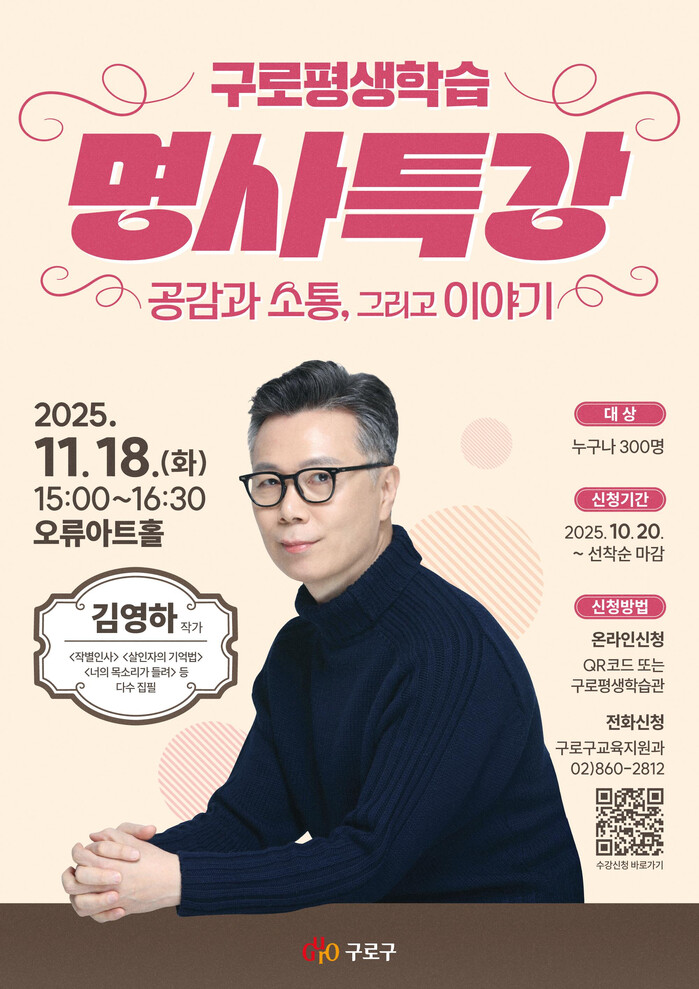 장인홍 구청장은 “김영하 작가의 이야기를 통해 구민들이 공감과 위로를 얻는 시간이 되길 바란다”며 “누구나 쉽게 배우고 공감할 수 있는 배움의 장을 지속적으로 넓혀가겠다”고 밝혔다.