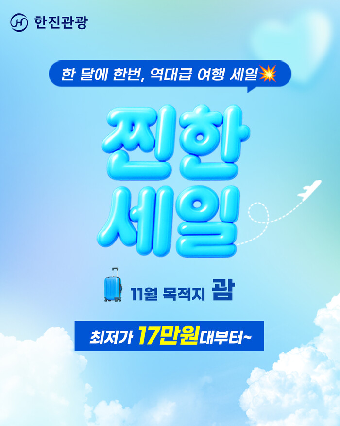한진관광이 본격적인 겨울 여행 시즌을 앞두고 매달 최대 혜택을 제공하는 ‘찐한세일’ 프로모션의 11월 목적지로 괌을 선정했다. 이번 ‘찐한세일 괌’ 편은 11월 6일(목)까지 한정된 기간 동안 열린다. 해당 기간 괌 인기 항공권과 에어텔 상품을 파격적인 가격에 구매할 수 있는 절호의 기회가 제공된다.
