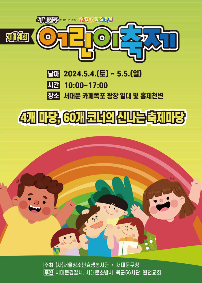 [시민일보 = 변은선 기자]서울 서대문구(구청장 이성헌)가 제102회 어린이날을 맞아 5월 4~5일 오전 10시부터 오후 5시까지 구청 인근 카페폭포 광장과 홍제천 변 일대에서 ‘제14회 서대문구 어린이축제’를 개최한다.