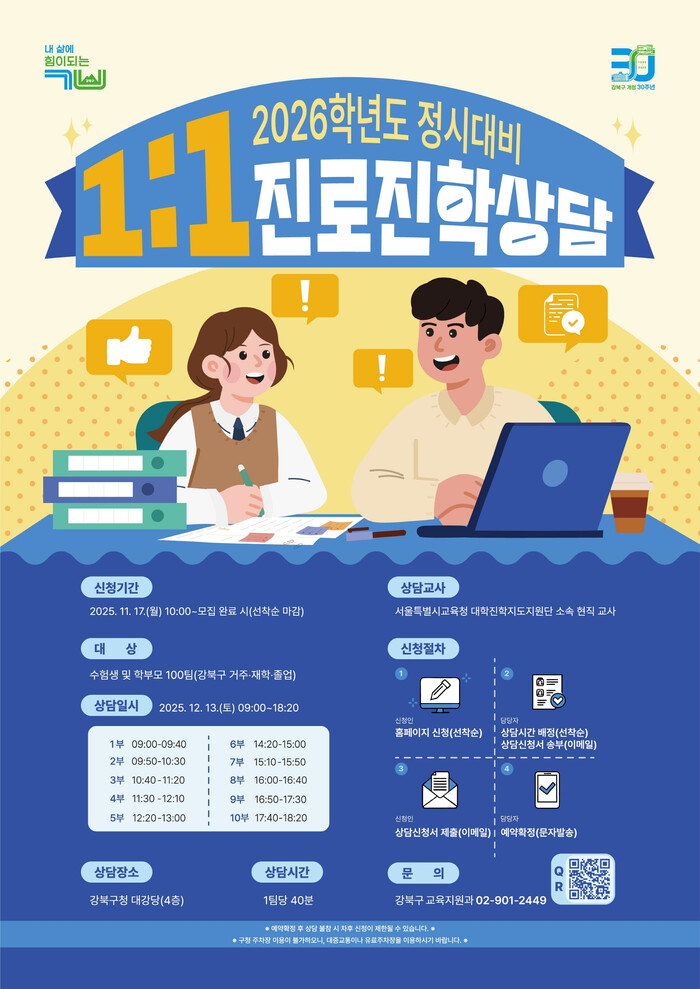 [시민일보 = 문민호 기자] 서울 강북구(구청장 이순희)는 오는 12월9일과 13일 강북구청 대강당에서 ‘2026학년도 정시 대비 대학입시 설명회’와 ‘1:1 진로진학 상담’을 연이어 개최한다고 밝혔다.