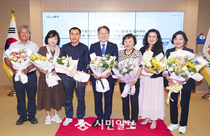 [광주=정찬남 기자] 강기정 광주광역시장이 27일 오전 시청 비즈니스룸에서 열린 ‘2025년 상반기 공무직 정년퇴임식’에 참석해 퇴직 공무원에게 공로패를 전달한 뒤 기념촬영을 하고 있다./광주광역시 제공