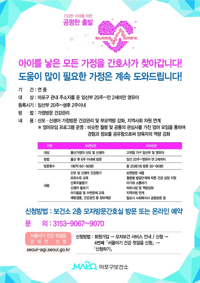 신청을 원하는 경우 서울아기 임신출산 정보센터 '모자 보건 서비스 안내→서울아기 건강 첫걸음 사업'에서 온라인 신청하거나 구 보건소 2층 모자방문간호실로 방문신청하면 된다.