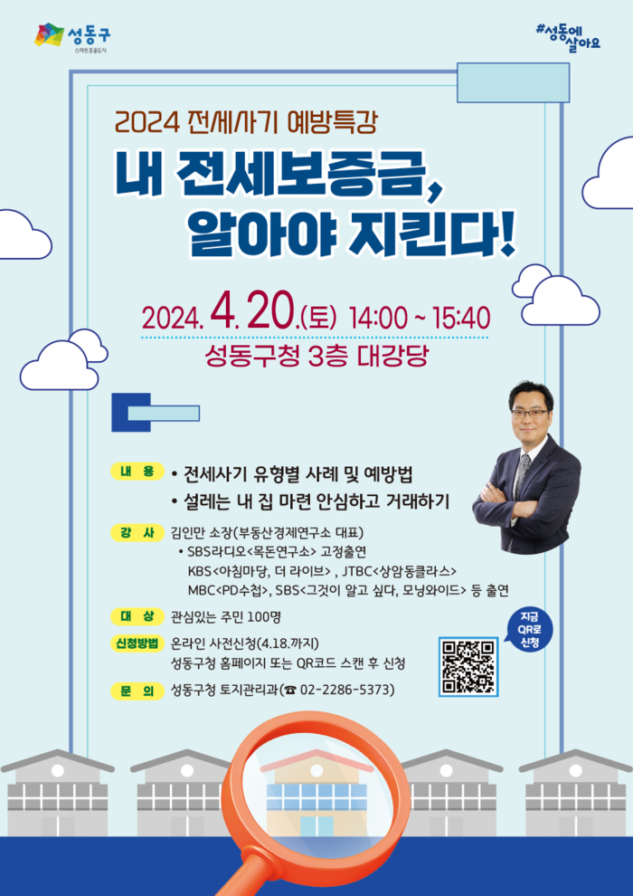 이번 특강은 전세사기 피해 예방에 관심 있는 누구나 들을 수 있으며, 참여를 원할 경우, 성동구청 누리집(새소식)을 통해 사전 신청하면 된다. 강의는 1시간 40분 동안 진행되며, 참가비는 무료다.