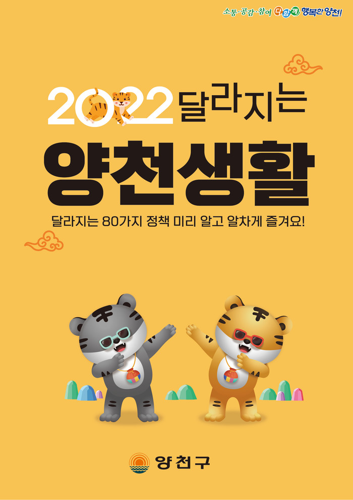 다양한 분야의 변화하는 주요 시책·제도, 정책 추진방향이 담긴 ‘2022년 달라지는 양천생활’은 양천구 홈페이지 행정공개 메뉴에서 누구나 열람 · 공유할 수 있다.