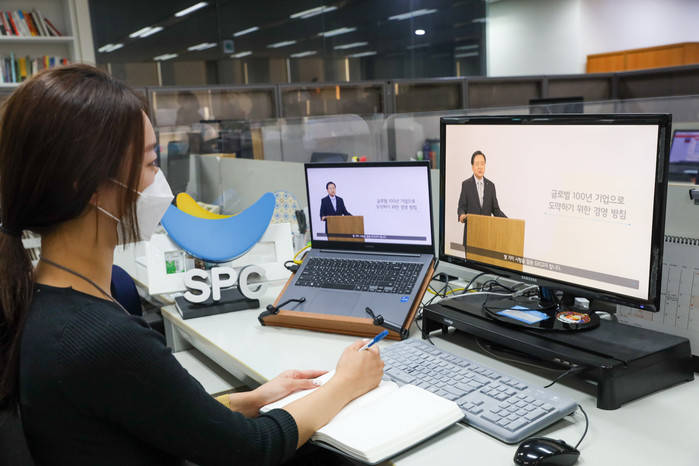 | ▲ 3일 SPC그룹은 비대면 온라인 방식으로 국내 및 글로벌 법인 임직원들이 다함께 참여하는 신년식을 진행했다. 허영인 회장은 신년사를 통해 ▲품질 초격차 ▲기업문화 혁신 ▲프랜차이즈 ESG경영 등 세 가지 경영 키워드를 제시했다. SPC그룹 직원이 자리에서 신년식을 시청하고 있다. (사진제공=SPC그룹) |