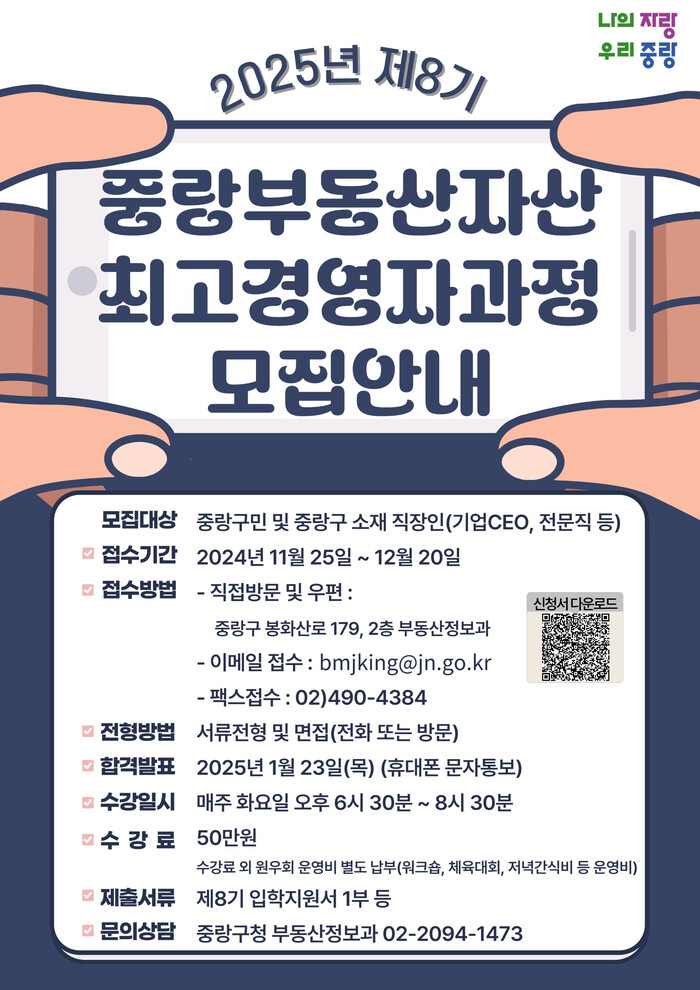 [시민일보 = 여영준 기자] 중랑구(구청장 류경기)가 오는 12월 20일까지 제8기 ‘중랑 부동산자산 최고 경영자과정’ 수강생을 모집한다.