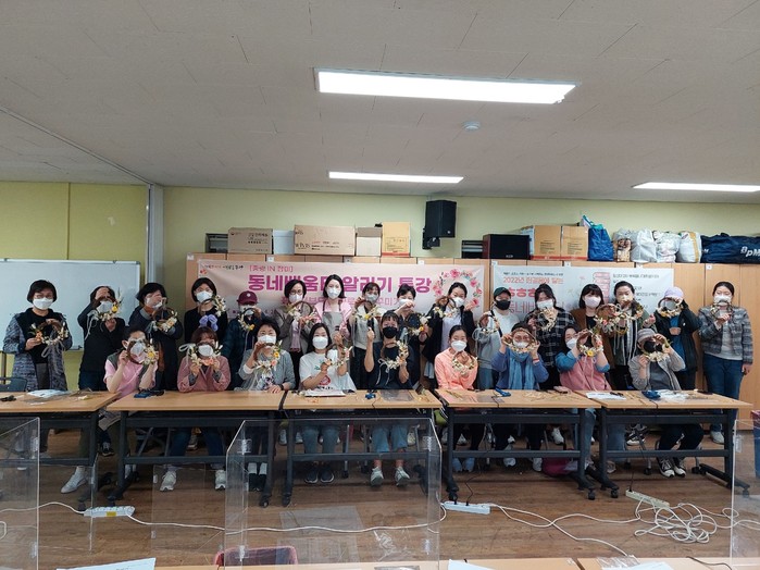 서울 중랑구가 2022년 서울장미축제를 앞두고 ‘중랑 in 장미’ 동네배움터 알리기 행사를 최근 두 차례 개최했다. 지역 동네배움터 두 곳에서 열린 강좌는 장미를 활용한 뷰티냅킨아트로 주차메모판 만들기, 프리저브드 장미로 리스꾸미기 등 두 가지 프로그램으로 진행됐다. 사진은 행사에 참여한 구민들이 기념촬영을 하고 있는 모습. (사진제공=중랑구청)