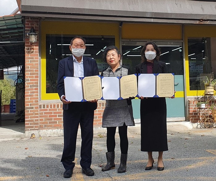 충남 아산시 송악면 행복키움추진단이 11일 송남휴게소와 송악면 저소득층을 위해 매월 일정 금액을 후원하는 협약을 체결했다. 사진은 협약식에서 관계자들이 기념촬영을 하는 모습. (사진제공=아산시청)