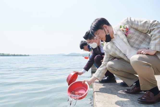 경기 여주시와 (주)세방은 최근 지역내 내수면 어업인 소득증대 및 수산자원 조성 사업의 일환으로 우리나라 토종어류 중 하나인 동자개 종자(4cm 이상) 16만4000마리를 이포보, 여주보, 강천보 일대에 방류했다. 사진은 이날 치어 방류행사 참가자들이 동자개를 방류하고 있는 모습. (사진제공=여주시청)