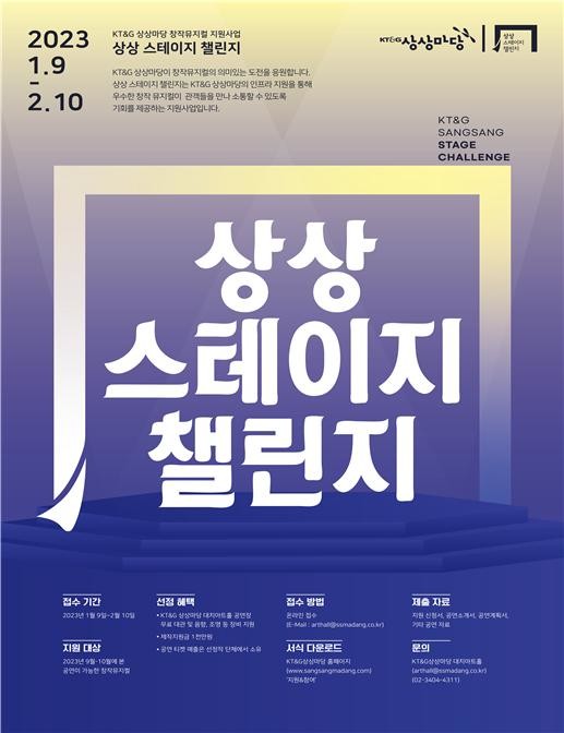 [시민일보 = 홍덕표 기자] KT&G가 국내 창작 뮤지컬 지원 프로그램인 '제6회 상상 스테이지 챌린지' 참여 작품을 오는 2월10일까지 공개 모집한다.