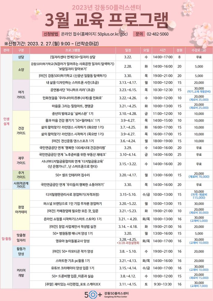 [시민일보 = 이대우 기자] 서울 강동구(이수희 구청장)는 중장년층의 행복한 노후준비를 지원하기 위해 오는 27일 오전 9시부터 강동50플러스센터 3월 교육프로그램 수강생을 모집한다고 밝혔다.