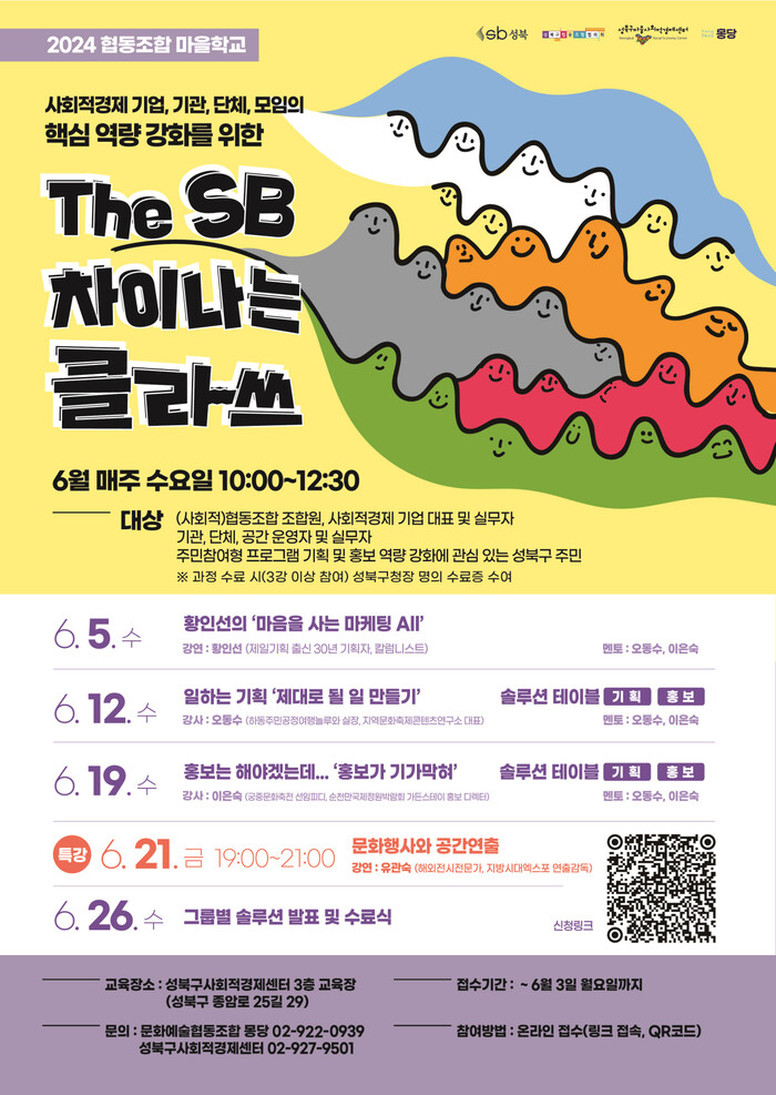 수강 신청은 성북구청 누리집 배너 또는 포스터의 QR코드를 통하여 온라인으로 가능하며, 6월 3일(월) 오후 6시에 마감된다. 교육과 관련한 문의 사항은 성북구 사회적경제센터 또는 문화예술협동조합 몽당로 연락하면 된다.