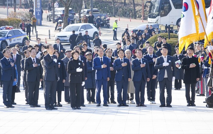 | ▲ 강기정 광주광역시장(앞줄 가운데)이 28일 오전 대구 달서구 두류공원 내 2·28민주운동 기념탑을 찾아 한덕수 국무총리, 홍준표 대구시장 등과 참배를 하고 있다./광주광역시 제공 |