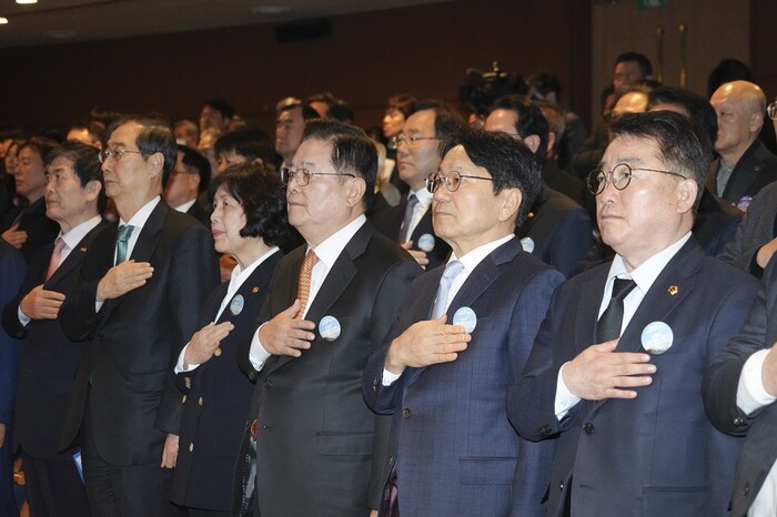| ▲ 강기정 광주광역시장이 28일 오전 대구 문화예술회관에서 열린 '제64주년 2‧28민주운동 기념식'에 참석해 국민의례를 하고 있다./광주광역시 제공 |