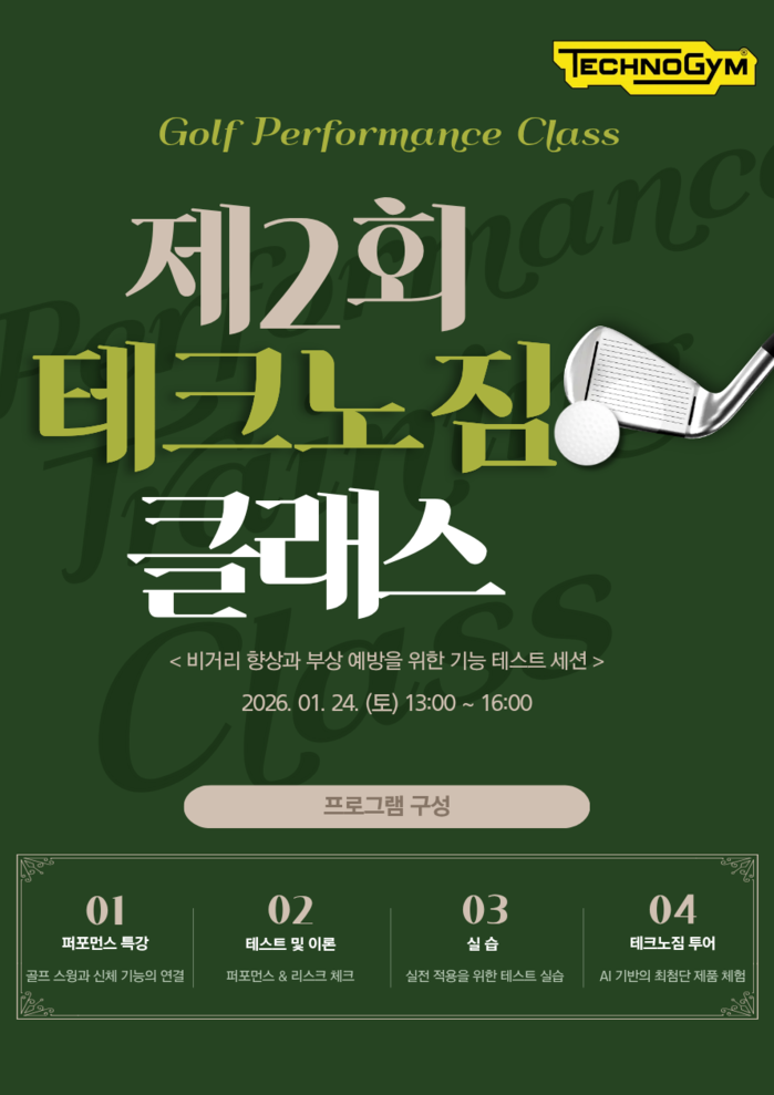 이번 ‘골프 피지컬 트레이닝 세션'은 골프 스윙 동작과 신체 기능의 상관관계를 과학적으로 분석하고, 퍼포먼스 향상과 동시에 부상 리스크를 최소화할 수 있는 실전 중심의 테스트 세션으로 구성됐다. 프로그램은 ▲테크노짐 센터 투어 ▲골프 스윙과 신체 기능의 연결 ▲퍼포먼스 & 리스크 체크 테스트 ▲실전 적용을 위한 테스트 실습 순으로 진행되며, 참가자들이 현장에서 즉시 적용 가능한 인사이트를 얻을 수 있도록 설계됐다.