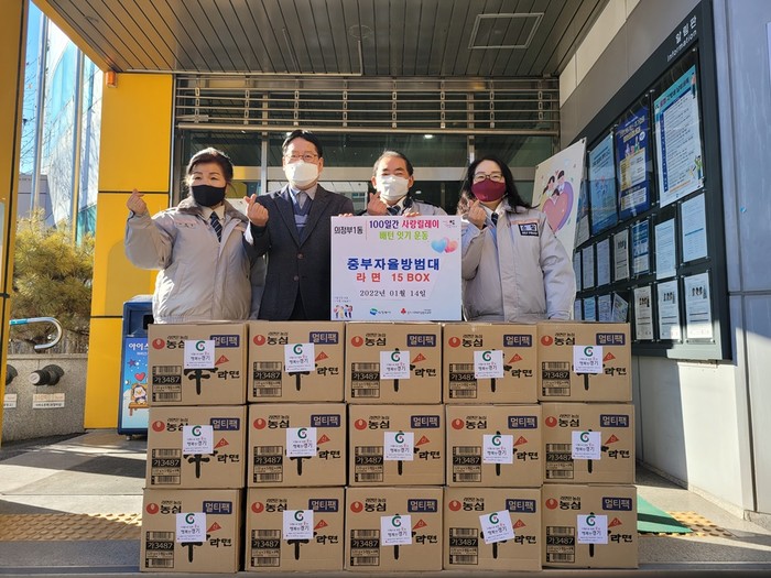 경기 의정부시 의정부1동 주민센터가 최근 의정부1동중부자율방범대로부터 100일간 사랑릴레이 배턴 잇기 운동에 동참하는 라면 15상자(38만원 상당)를 기탁 받았다. 사진은 전달식에서 관계자들이 기념촬영을 하는 모습. (사진제공=의정부시청)