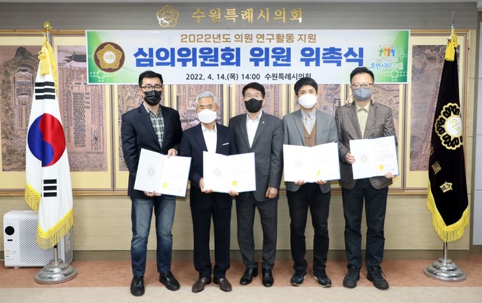 [수원=임종인 기자] 경기 수원시의회는 지난 14일 의회 부의장실에서 ‘의원연구 활동 지원 심의위원회 위원 위촉식’을 열고 임기가 만료된 4개 분야 위원 4명을 신규 위촉했다고 밝혔다.