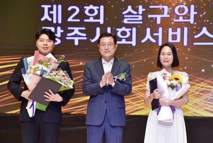 [광주=정찬남 기자] 이용섭 광주광역시장이 8일 오후 서구 광주학생교육문화회관 공연장에서 열린 '제2회 광주사회서비스원의 날' 기념식에 참석해 유공자 표창을 한 뒤 기념촬영을 하고 있다./광주광역시 제공