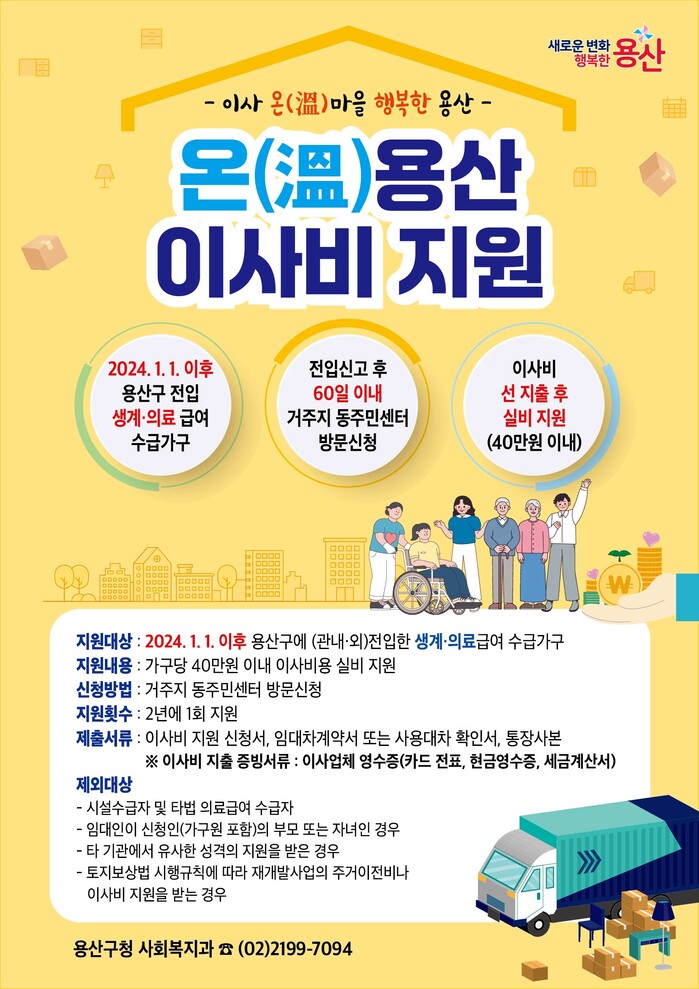 [시민일보 = 홍덕표 기자] 서울 용산구(구청장 박희영)는 기초생활수급가구의 주거 안정과 경제적 부담 경감을 위해 '2024년 온(溫)용산 이사비 지원' 사업을 추진한다고 3일 밝혔다.