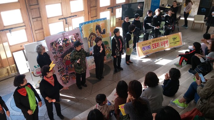 | ▲ 중랑구립정보도서관과 예술공동체 스케네가 2008년부터 2015년까지 8년간 함께 운영해온 시니어 문화예술 사업 ‘중랑이’ 프로그램을 진행 중인 모습 (사진=중랑구청 제공) |