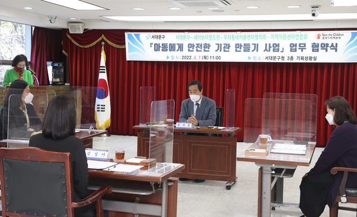 서울 서대문구가 지난 7일 국제아동권리 NGO 세이브더칠드런 중부1지역본부·서대문구 우리동네키움센터협의회·서대문구 지역아동센터연합회와 ‘아동에게 안전한 기관 만들기’ 업무협약을 체결했다. 협약으로 지역내 우리동네키움센터 등 총 13개의 아동돌봄기관은 아동에게 안전한 기관 만들기 사업을 추진한다. 사진은 협약식에서 문석진 구청장(가운데)이 관계자들과 대화를 나누고 있는 모습. (사진제공=서대문구청)