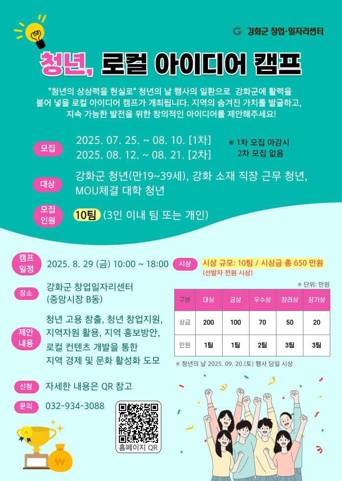 [인천=문찬식 기자] 인천 강화군 창업ㆍ일자리센터가 '2025년 청년의 날 행사'의 일환으로 오는 8월29일 ‘청년, 로컬 아이디어 캠프’를 개최한다고 밝혔다.