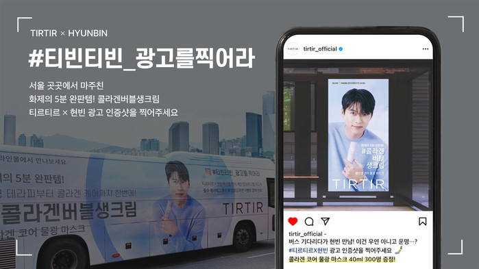 티르티르의 ‘티빈티빈 광고를 찍어라’ 이벤트는 버스 쉘터와 랩핑버스, 버스 광고 등 서울 시내 곳곳에서 발견할 수 있는 티르티르X현빈 광고를 자유롭게 촬영하여 지정 태그와 함께 업로드 하는 이벤트로 오는 4월 말 자정까지 공개 게시글에 한해 자동 응모된다. 이 이벤트는 티르티르의 공식 계정 팔로워들을 대상으로 진행되며 공식 계정과 #티빈티빈_광고를찍어라 태그를 필수로 달고 전체공개로 업로드 해야하는 점 유의해야 한다.