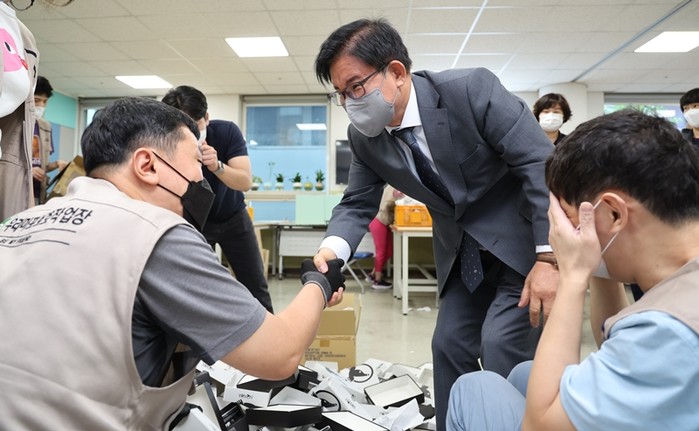박강수 서울 마포구청장은 26일 우리마포복지관(신촌로26길 10)을 방문했다. 이날 박 구청장은 노인들에게 안부를 묻고, 작업 중인 장애인 근로자에게 격려를 전하는 등 주민과 열린 소통을 이어나갔다. 사진은 이날 우리마포복지관 3층 장애인보호작업장을 방문한 박 구청장이 작업 중인 장애인근로자들을 격려하고 있는 모습. (사진제공=마포구청)