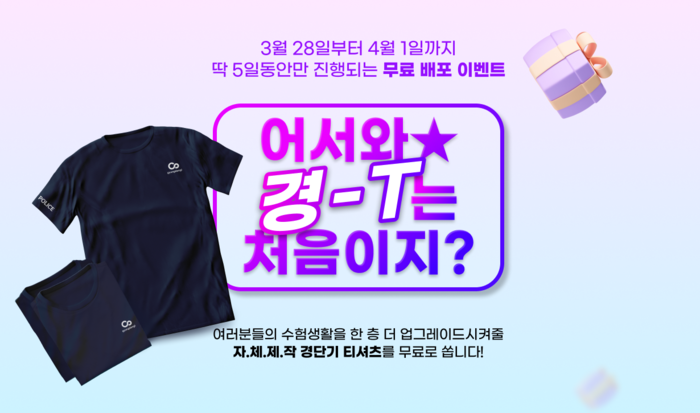 경단기 관계자는 “경찰 공무원 시험을 준비하는 수험생들의 니즈와 합격생들의 학습법을 반영해 이번 이벤트를 준비했다”며 “직접 제작한 경단기 티셔츠와 경단기의 노하우를 담은 단기합격고득점론이 수험생들에게 도움이 되기를 바란다”고 말했다.