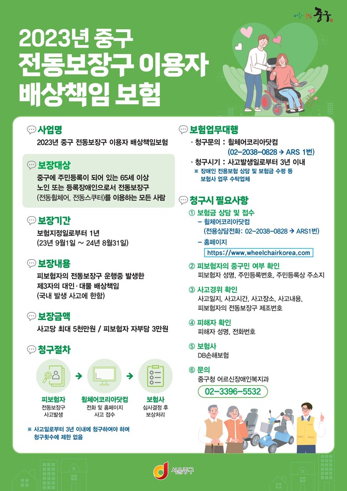 [시민일보 = 여영준 기자] 중구(구청장 김길성)는 오는 9월1일부터 ‘전동보장구 배상보험’에 가입한다고 밝혔다.