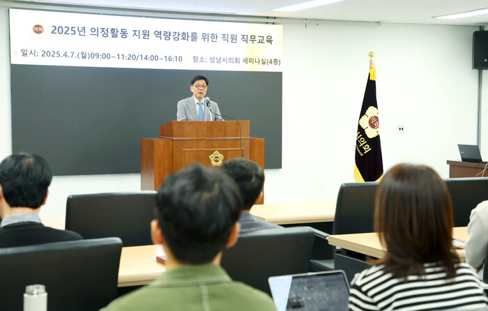 [성남=오왕석 기자] 성남시의회는 7일 의회사무국 전 직원을 대상으로 ‘효율적인 지방의회 회의 운영 및 자치법규 입안 실무’ 교육을 실시했다. 이번 교육은 빠르게 변화하는 행정 환경 속에서 직원들의 실무 역량을 강화하고, 보다 전문적인 의회 운영을 지원하기 위해 마련됐다.