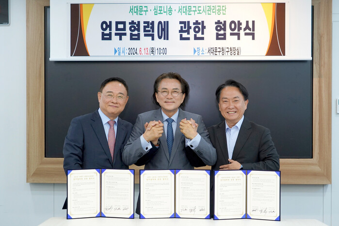 | ▲ (오른쪽부터) 이성헌 서대문구청장, 함신익 심포니송 대표, 한운영 서대문구도시관리공단 이사장이 업무협력 협약 후 기념 촬영을 하고 있다. (사진=서대문구청 제공) |