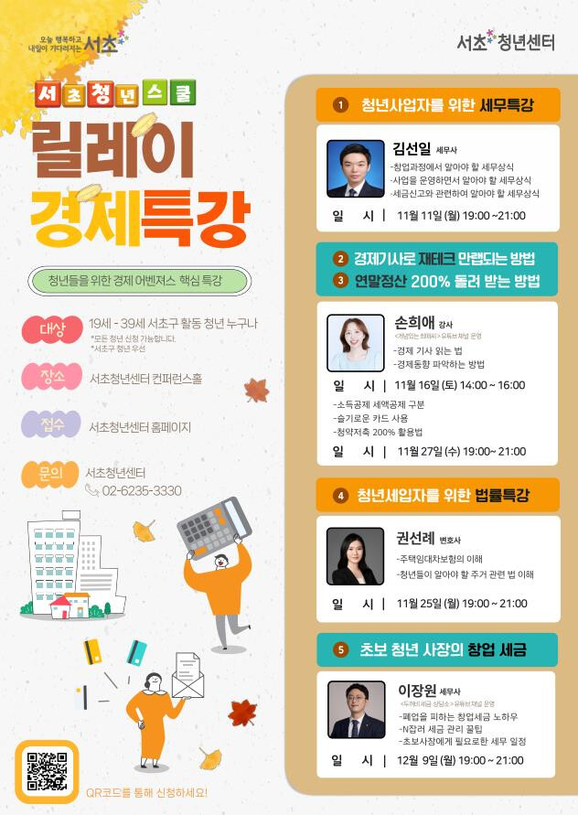 이번 특강에는 청년들이 생활 속에서 꼭 알아야 할 필수 경제 지식과 초보 청년 사장을 위한 실질적인 세금 관리 정보를 담았다. 일상생활에서 경제를 이해하고, 경제적 자립을 위한 기초 지식을 다질 수 있도록 총 5회에 걸쳐 체계적으로 강의가 진행될 예정이다.
