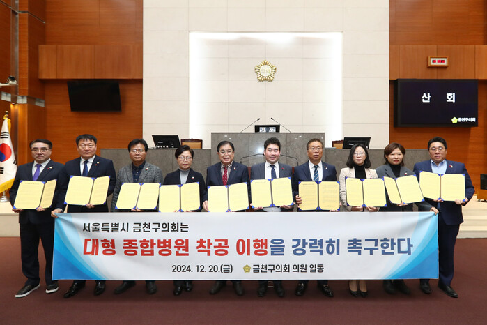 구의회는 촉구결의문을 통해 ▲정부 및 서울특별시는 금천구 대형 종합병원의 실질적이고 조속한 착공을 위한 정책적 지원과 행정적 협력 강화 ▲금천구청과 (주)부영주택, 우정의료재단은 종합병원 착공 및 완공 일정에 대한 구체적인 계획을 세워 구민들에게 명확히 전달 ▲금천구청과 (주)부영주택, 우정의료재단은 대형 종합병원 건립 실현이 현실적으로 불가능하다면 실행 가능성 높은 대안을 구민들에게 제시 ▲대형 종합병원의 실질적이고 조속한 건립에 대한 금천구민들의 열망과 절실함을 모든 관계 기관에서 인식할 것을 촉구했다.