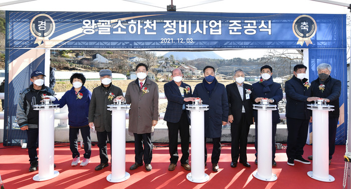 경기 양평군이 최근 양평읍 봉성1리 왕골6교 현장에서 ‘왕골소하천 정비사업 준공식’을 개최했다. 왕골소하천정비 사업은 국·군비 총사업비 101억원을 투입해 홍수 대비 제방을 쌓고, 유속이 빠른 왕골천의 특성에 맞춰 조경석을 쌓아 총 2896m의 호안을 정비했다. 사진은 정동균 군수(오른쪽 다섯 번째)와 관계자들이 준공식을 진행하고 있는 모습. (사진제공=양평군청)