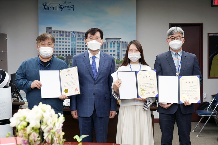 최근 서울 동대문구가 효심으로 부모를 봉양함과 동시에 본연의 업무에도 최선을 다한 휘경1동 이기도 주무관 등 직원 3명을 선정해 표창 수여식을 진행했다. 사진은 수여식에서 유덕열 구청장(왼쪽 두 번째)과 효행 공무원 표창을 수상한 직원들이 기념촬영을 하고 있는 모습. (사진제공=동대문구청)