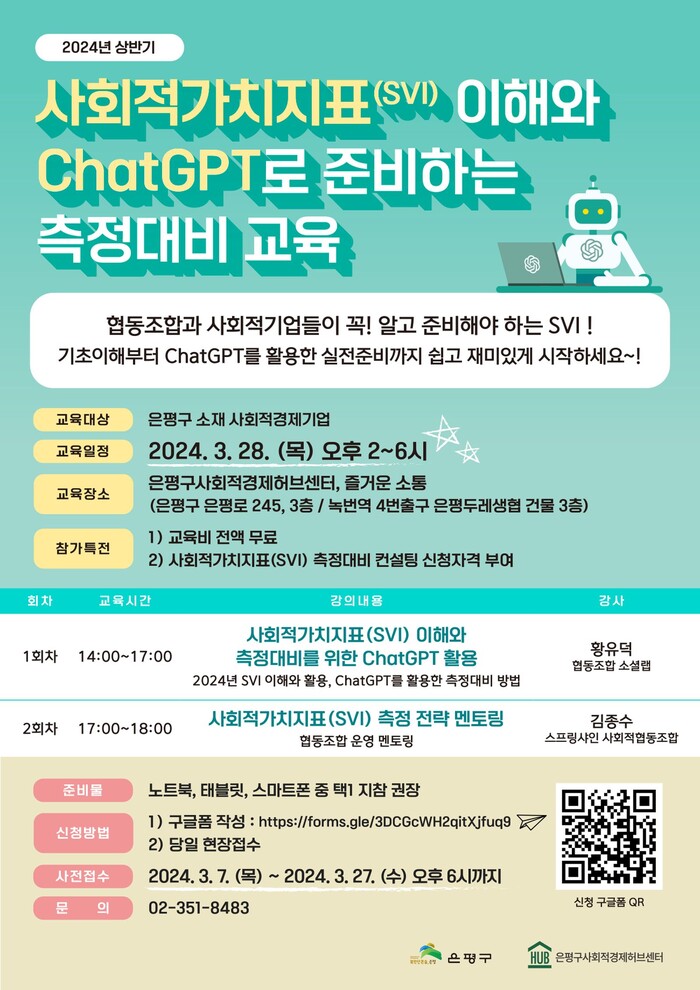 [시민일보 = 이대우 기자] 서울 은평구(구청장 김미경)는 오는 28일 오후 2시부터 은평구 사회적경제허브센터 3층 즐거운 소통에서 ‘사회적가치지표(SVI)이해와 챗지피티(ChatGPT)로 준비하는 측정대비 교육’을 실시한다고 밝혔다.