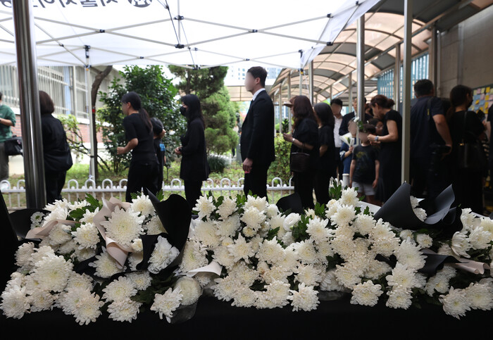 | ▲ 4일 오전 서울 서초구 서이초등학교에서 추모객들이 헌화를 위해 기다리고 있다. (사진=연합뉴스 제공) |
